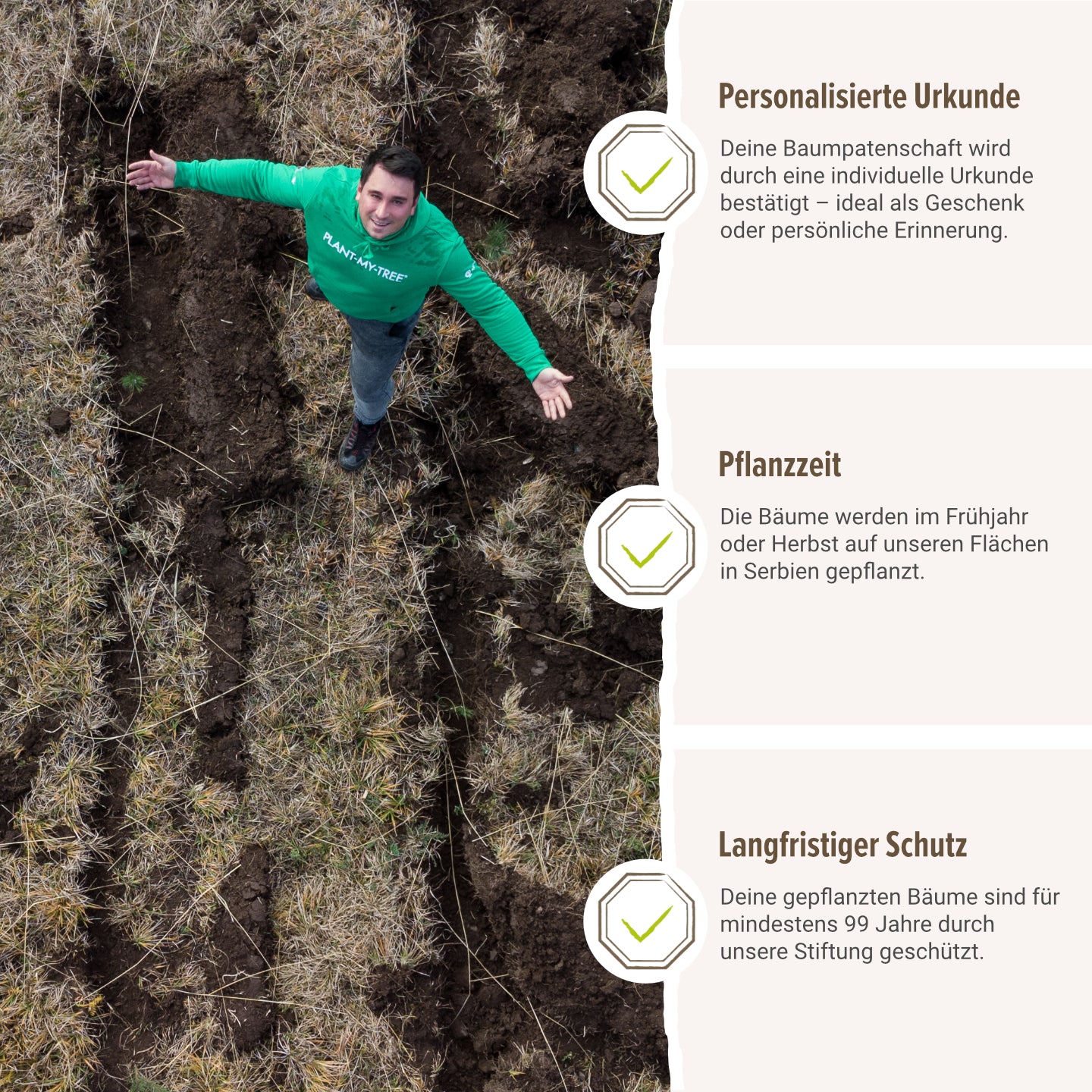 Der Pflanz- und Pflegestandard von PLANT-MY-TREE® garantiert eine nachhaltige und sorgfältige Aufforstung. Jeder Baum wird unter strengen ökologischen Kriterien gepflanzt und aktiv betreut, um ein gesundes Wachstum sicherzustellen. Dabei wird auf die richtige Baumart und optimale Standortbedingungen geachtet. Die langfristige Pflege der Wälder stellt sicher, dass die Bäume mindestens 99 Jahre bestehen bleiben und effektiv zur CO₂-Reduktion beitragen. Dies sichert die Qualität der Projekte und maximiert den Klimaschutzbeitrag.